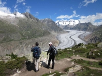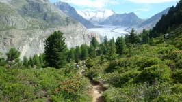 Eine Strecke mit herrlicher Aussicht auf den Aletschgletscher, auf viele Walliser Gipfel, einer herrlichen Fernsicht. Und doch kann man dies nicht immer genie�en, da die Strecke durch viele Wurzeln, Steine, Stufen und auch schmalen Wegpassagen hohe Konzentration verlangt.